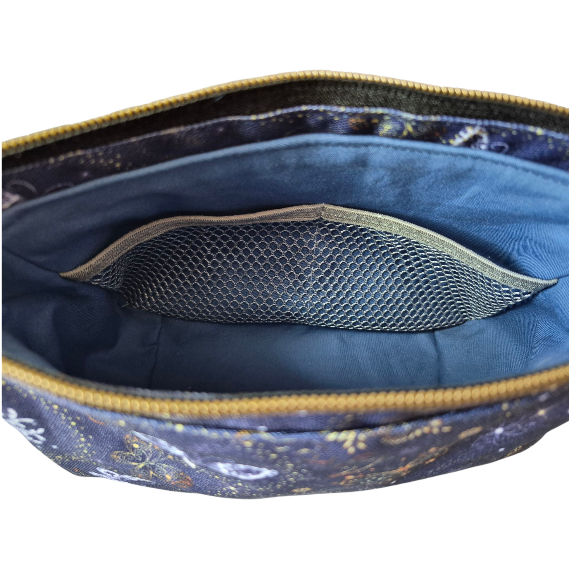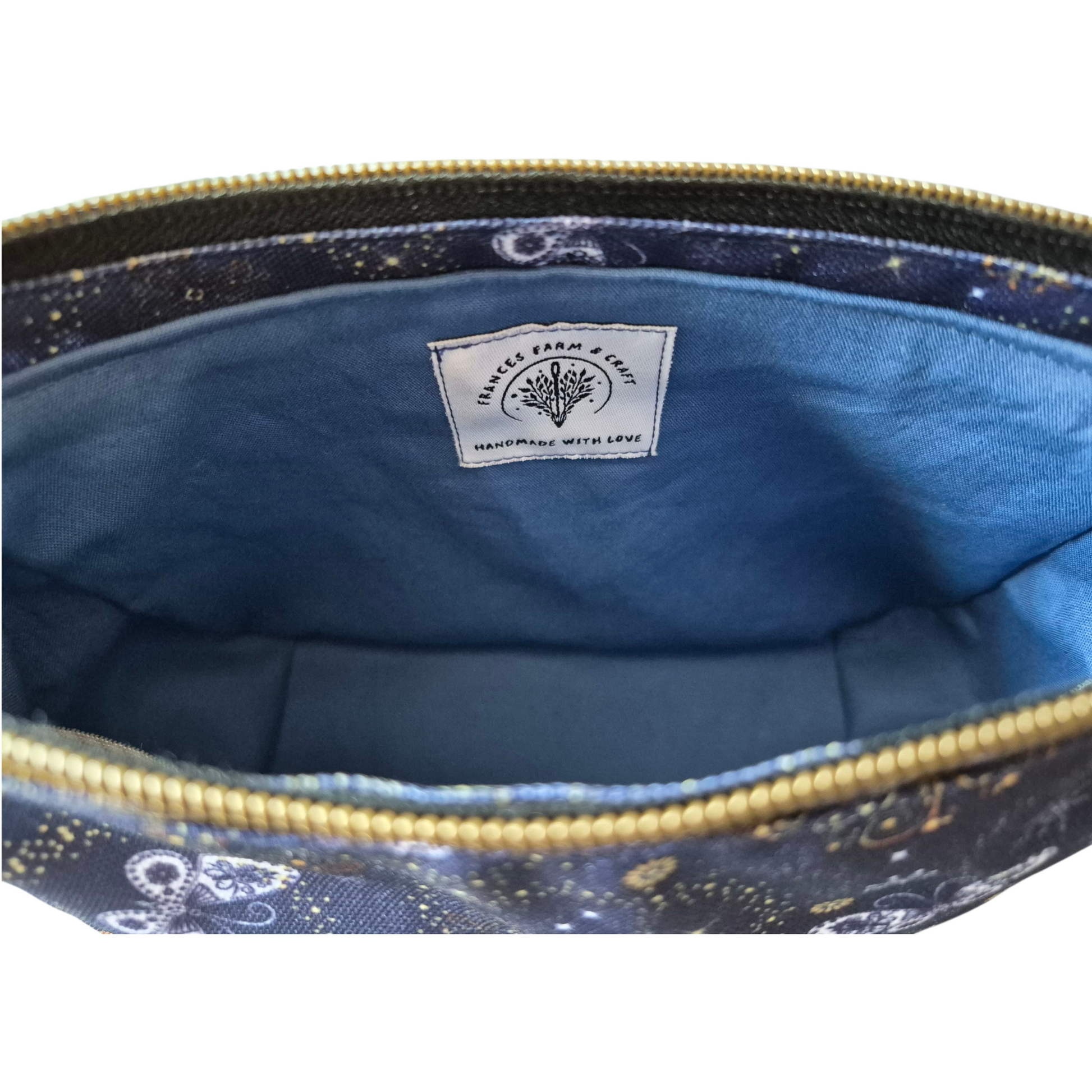 Cosmetic bag: waterproof canvas fabric, cotton lining, vinyl gusset, antique gold zipper, interfacing, mesh pocket inside. Size: ~ 8" Wide x 6" Tall x 3" Deep
