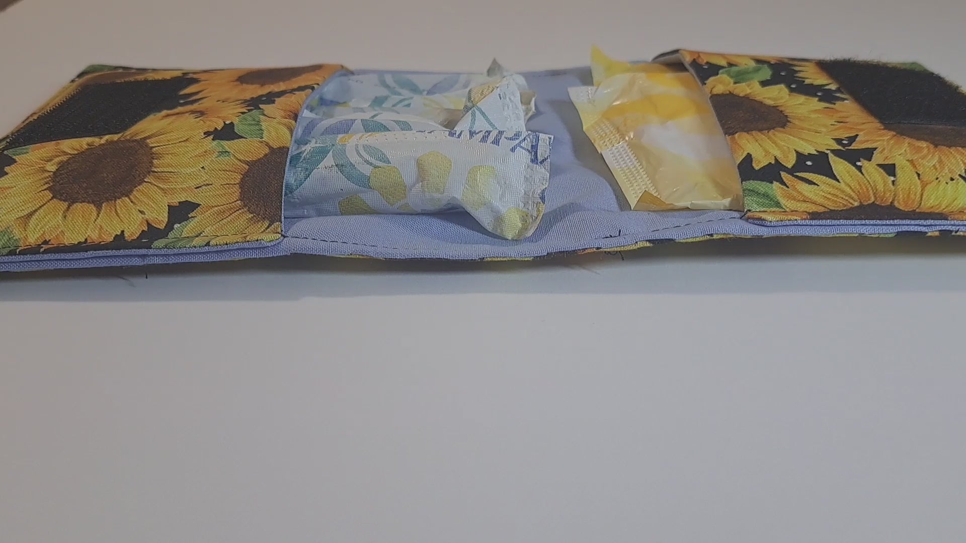 Each pouch can hold for example 4-5 tampons and 2 pads.