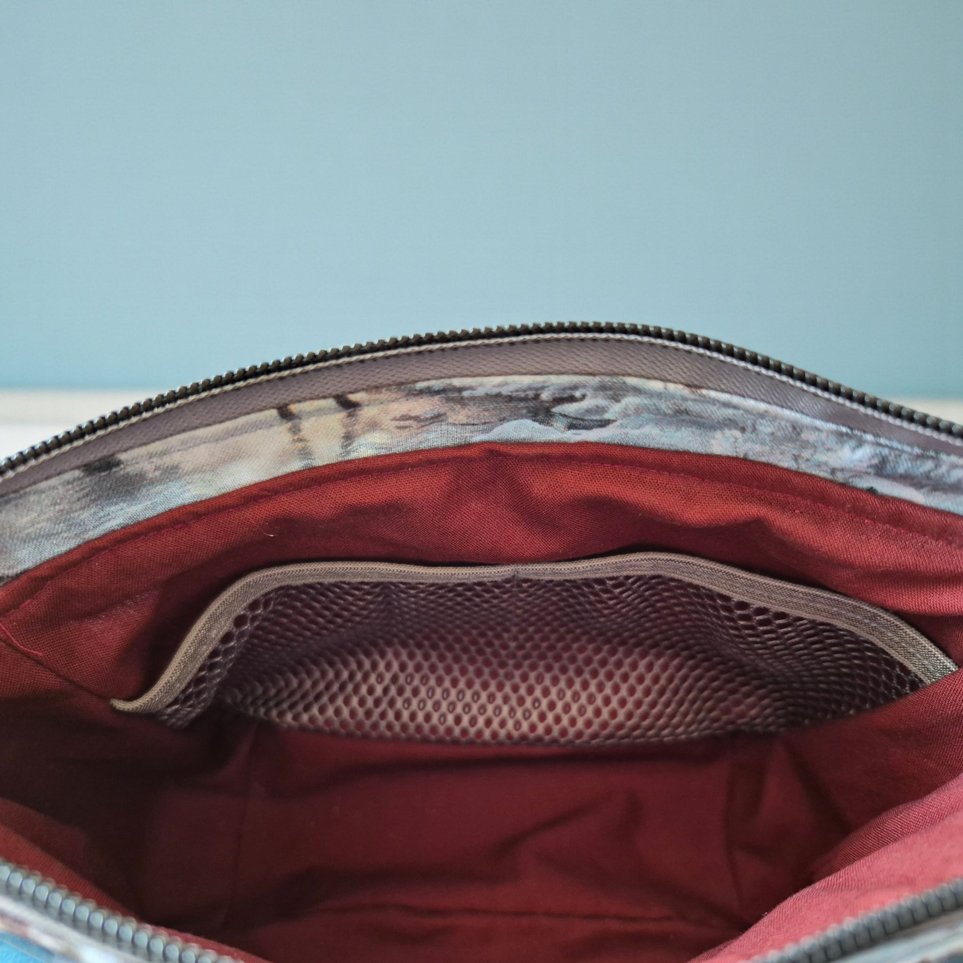 Cosmetic bag: cotton fabric, vinyl gusset, gunmetal zipper, interfacing, mesh pocket inside. Size: ~ 8" Wide x 6" Tall x 3" Deep