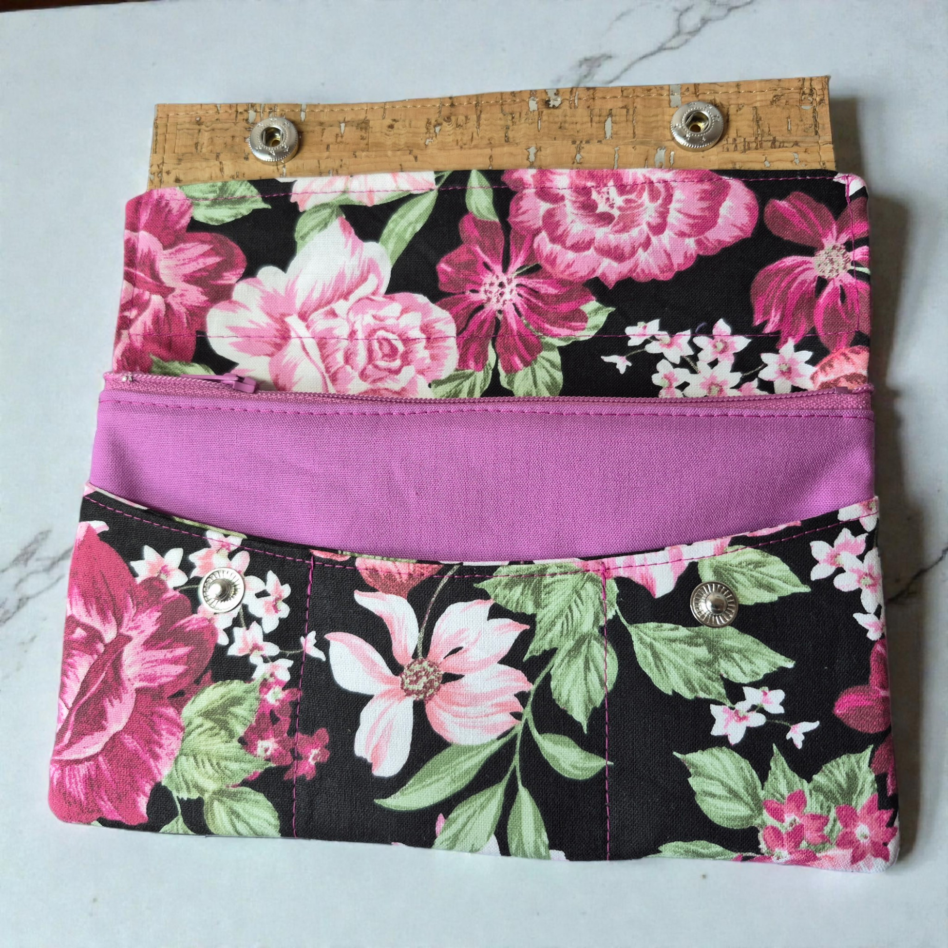 This handmade wallet includes a zippered coin pocket, a bill compartment, and a durable cork tab with a secure snap-button closure to keep your essentials protected. Thoughtfully crafted with quality materials, it’s perfect for women who appreciate artisan design, sustainable style, and timeless beauty.